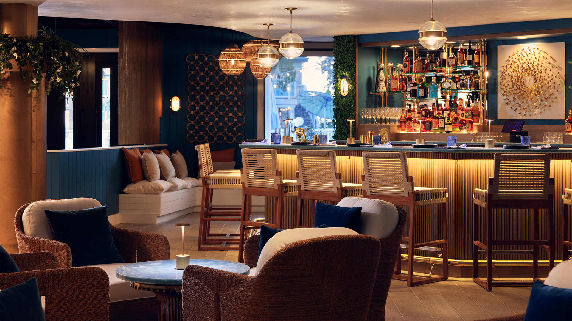 During the resort’s renovations in 2022, the team discovered two old ship wheels tucked away in a storage closet, their origins unknown. Rather than discarding them, a skilled woodworker on-site repurposed them into a light fixture, now serving as the restaurant’s focal point.